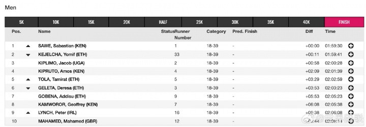 获得亚军的科杰尔查同样打开两小时,1小时59分41秒创造人类首马历史最好成绩;雅各布·基普里莫获得季军,2小时00分28秒同样超越了基普图姆保持的原世界纪录!